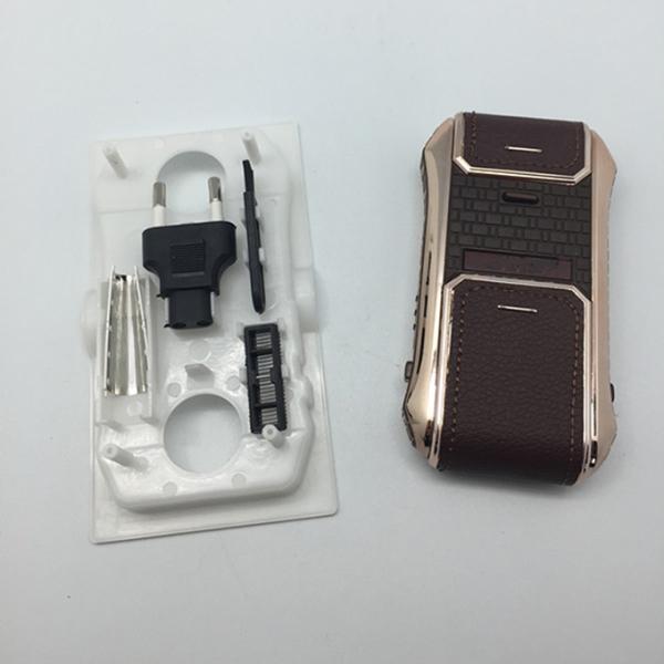 | Description | 1.Stainless steel outer foil with sideburns trimmer 2.Double blades 3.Include cleaning brush 4.Rechargeable shaver 5.Floating heads for closer shaving 6.110-220V 50HZ/60HZ 3W 7.60 minutes continuous operation when full recharge 8.Wireless,convenient to operate 9.Charging Time: 8-10 hours 10.Battery capacity: 600 mah 11.Color: Bronze |